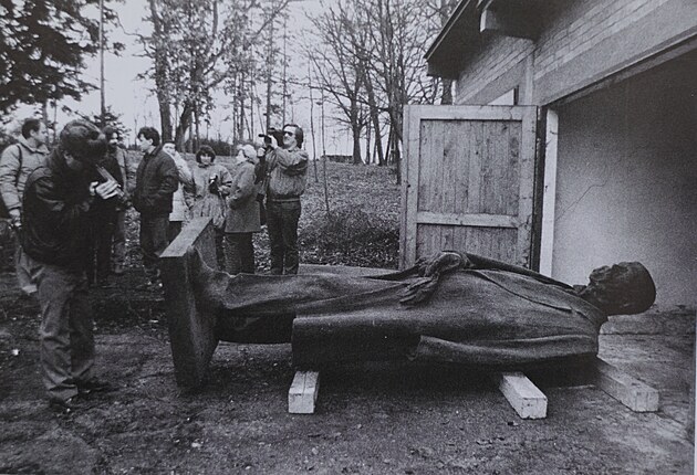 Vyzvednutí sochy T. G. Masaryka z garáže v areálu zámeckého parku v Klečůvce u Zlína. Fotografie je z knihy Moje svědectví o listopadových událostech 1989 ve Zlíně. Autor knihy František Bobák