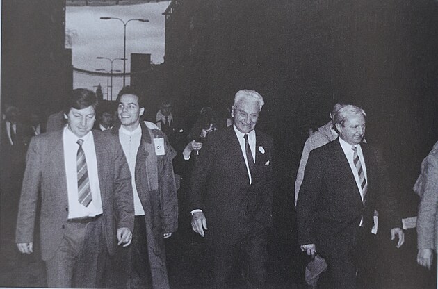 Představitel studentů Jiří Devát (druhý zleva) v doprovodu Tomáše Bati ml. při prohlídce areálu národního podniku Svit. Fotografie je z knihy Moje svědectví o listopadových událostech 1989 ve Zlíně. Autor knihy František Bobák