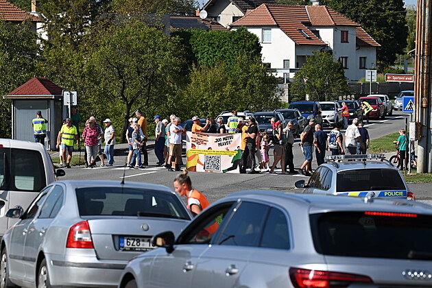 Lidé v Horním Lapači na Kroměřížsku blokovali silnici mezi Holešovem a Fryštákem na protest proti nedokončené dálnici. (11. září 2025)